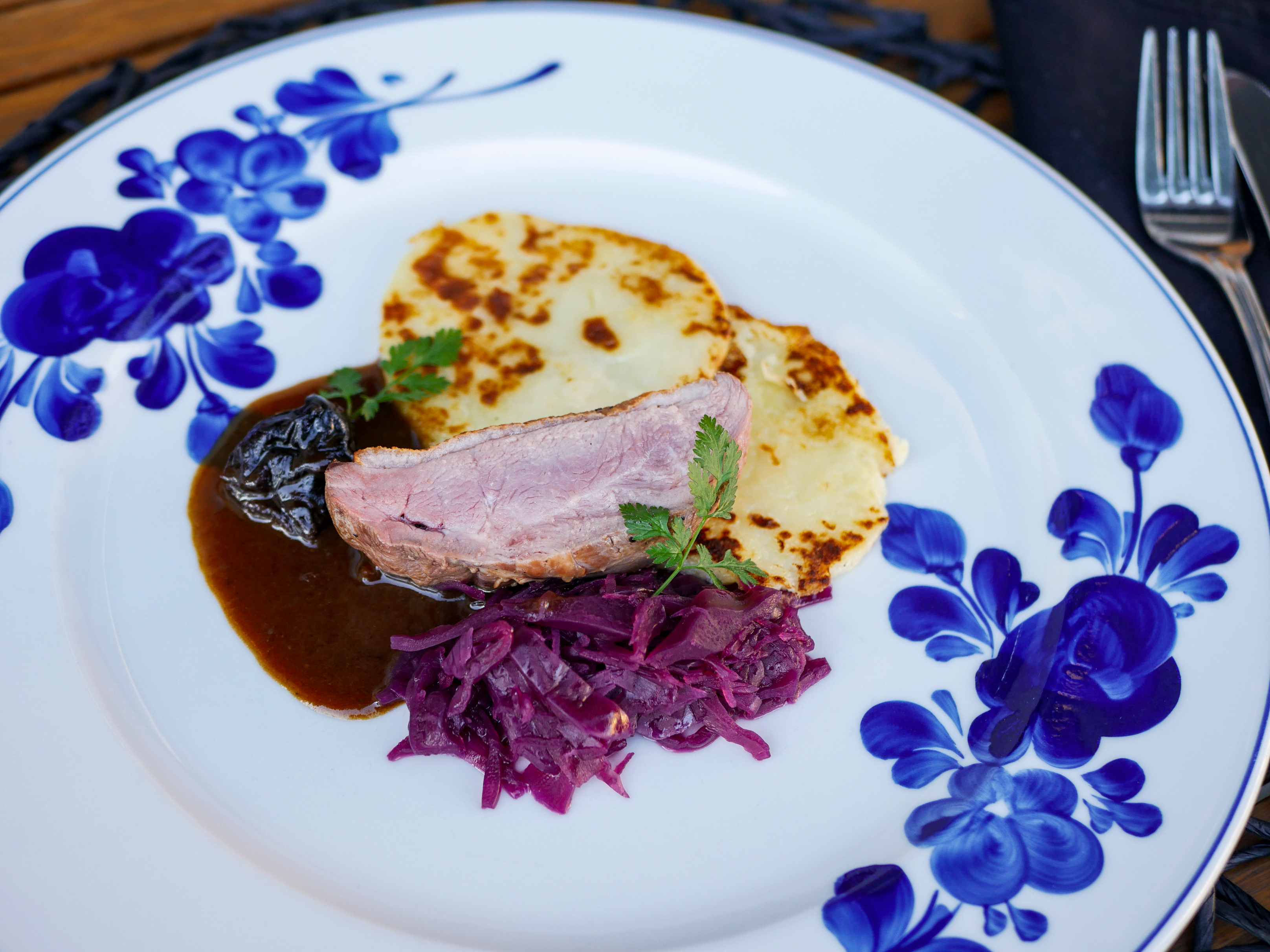Kachní prso s červeným zelím a marinovanými švestkami, bramborové placky