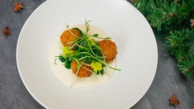Kachní stehno zbavené kůže zalijeme šťávou z výpeku, přidáme nasekanou petrželku a důkladně promícháme. Směs by měla mít tuhou konzistenci, šťávy nesmí být příliš. Z nastrouhaných brambor, polohrubé mouky, vejce a soli připravíme vláčné těsto, ze kterého vyválíme plát tlustý půl centimetru. Z něj pomocí skleničky (průměr cca 8 cm) vykrájíme kolečka. Doprostřed těsta nanášíme polévkovou lžící směs z roztrhaného kachního masa. Kraje těsta spojíme a vytvoříme kuličky. Takto připravené krokety obalíme v trojobalu z mouky, vejce a panko strouhanky. Následně smažíme v oleji na 160 °C dozlatova, případně pečeme v troubě na 180 °C cca 15-20 minut. Smetanu svaříme do konzistence omáčky, přidáme přecezené stroužky uvařeného česneku v oleji, osolíme a pomocí tyčového mixéru připravíme hladkou omáčku. Špenát zprudka opečeme na oleji z česnekových stroužků a lehce dosolíme. Poté kroketu s omáčkou a špenátem můžeme podávat.